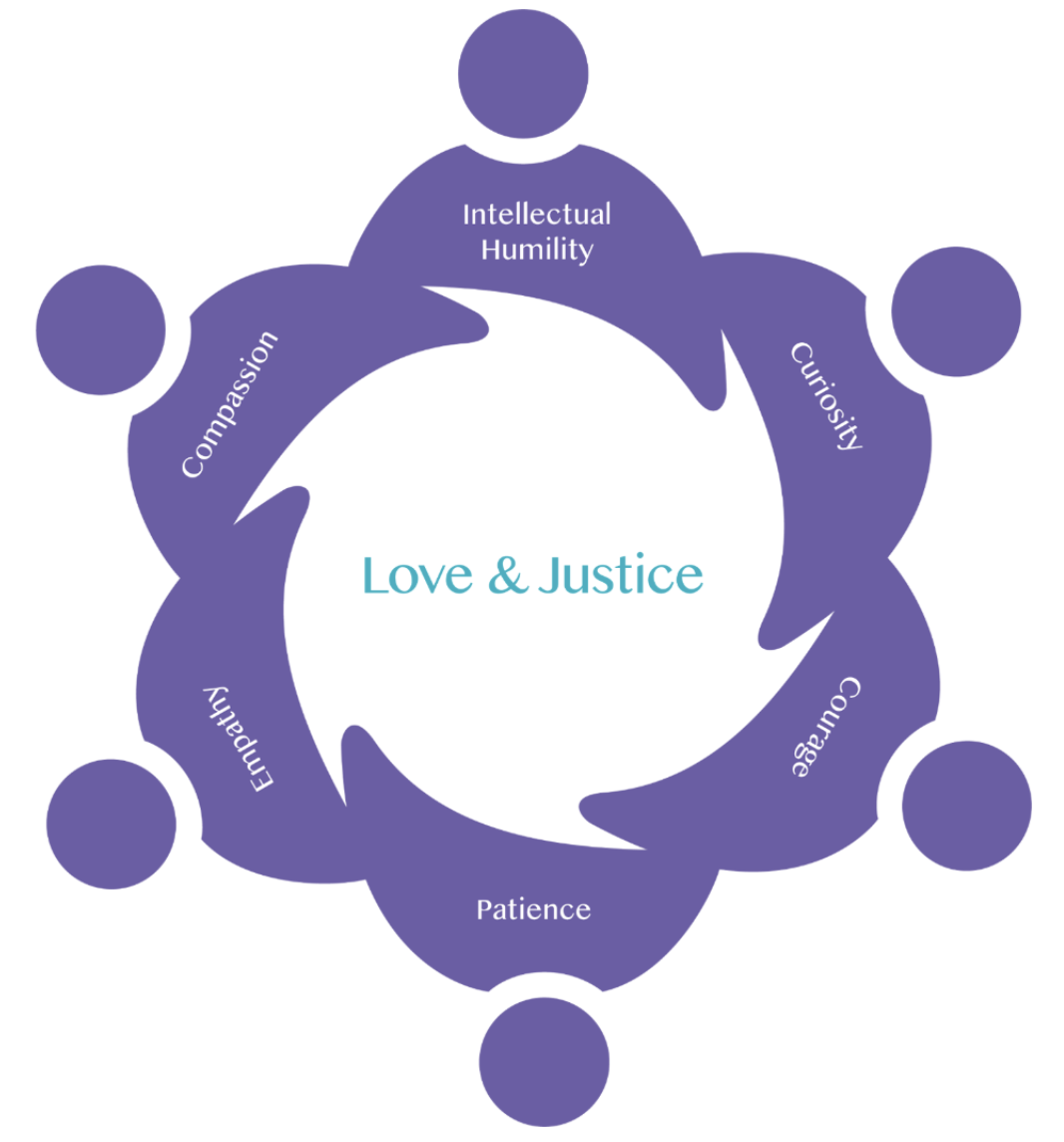 For example, curiosity motivates us to learn more about someone’s story, while virtues like humility and justice help ensure that curiosity is expressed with respect. Courage gives us the fortitude to listen to someone even when their perspective is difficult to hear—anchored in a commitment to the dignity and humanity of all people.